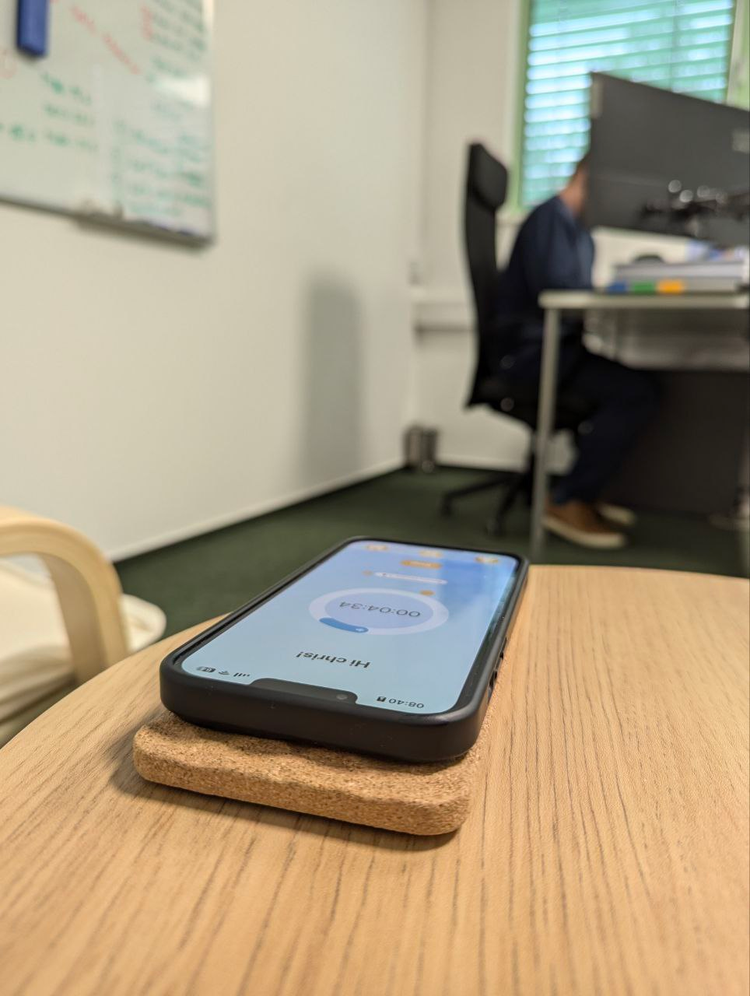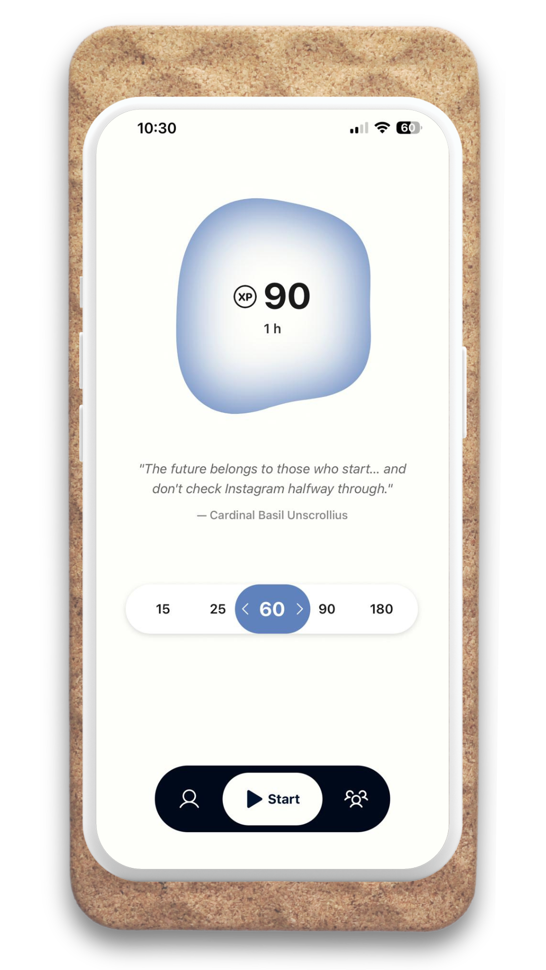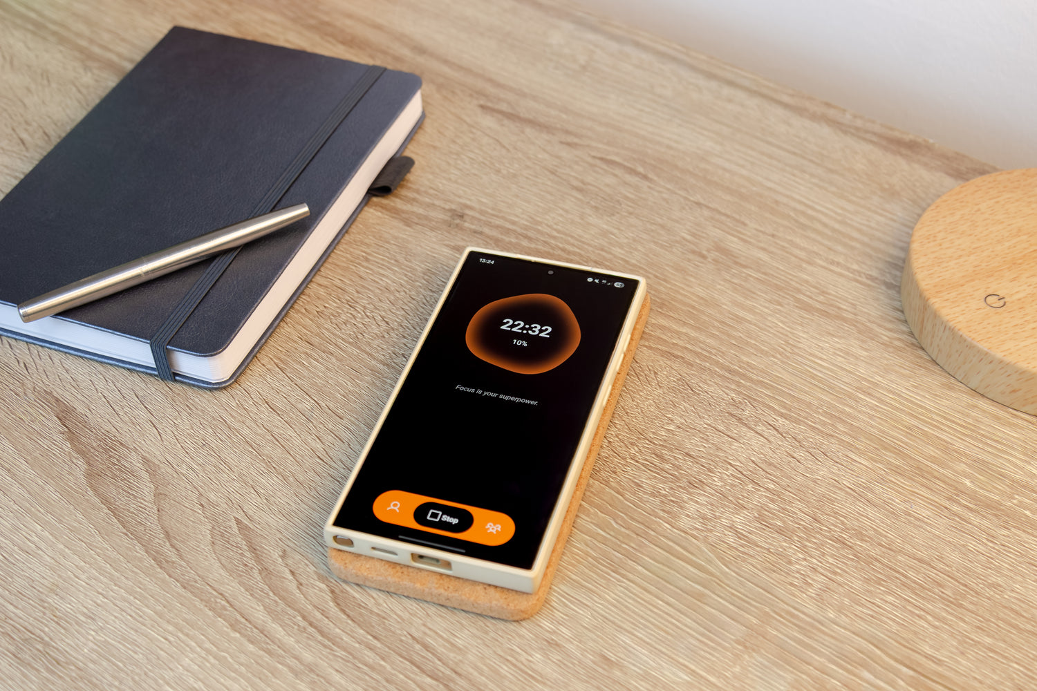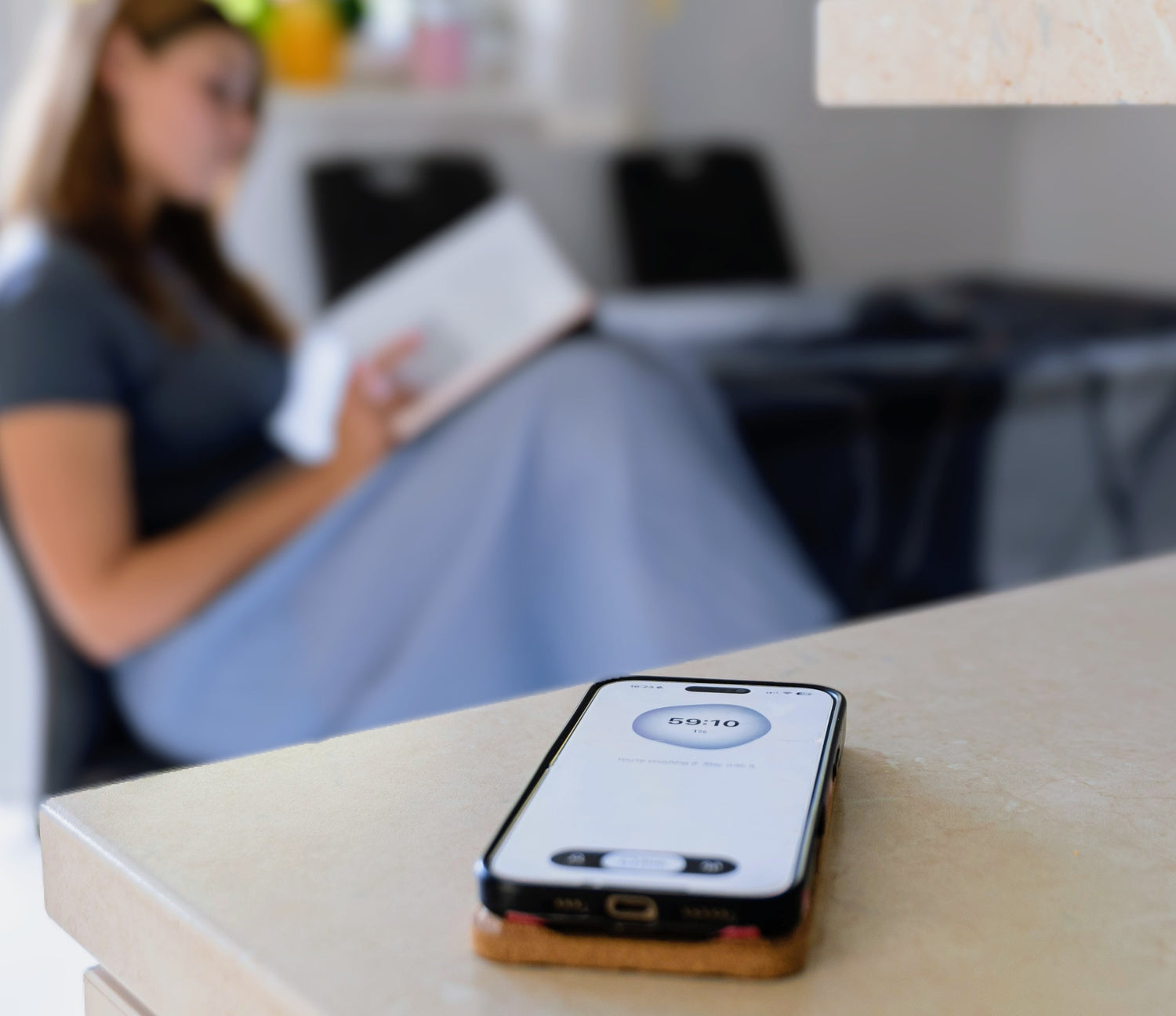 Choose a focus session length in the app and place your phone on the Humanodoro Pad. The session automatically starts when the app detects the Pad, turning a small action into a focus ritual.